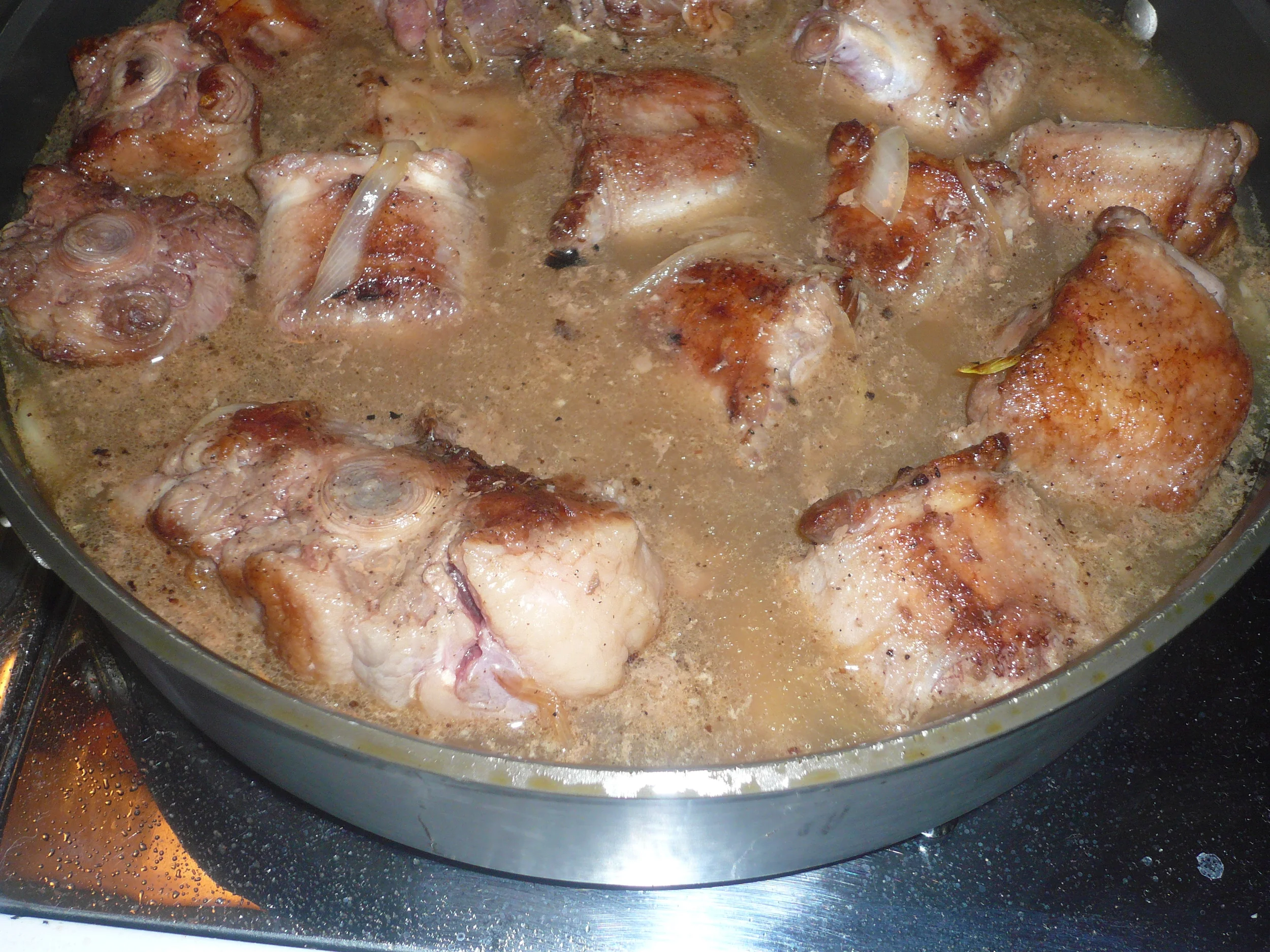 Go get a beer, make a pie, whatever. Let your oxtails simmer for an hour and a half. Turn them over and walk away again. The oxtails are done when the meat is willingly pulling away from the bone. Reduce the liquid in the pan if necessary to make a sauce.