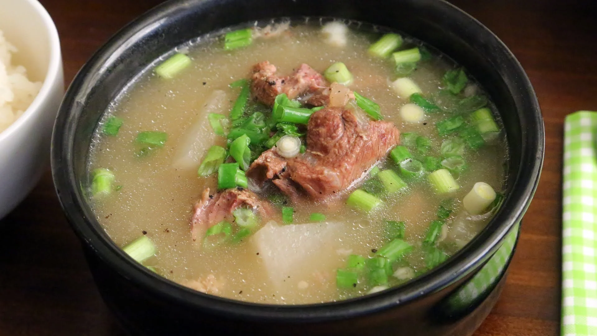 When you are ready to serve, heat soup in a pan and saute oxtail meat. Put the meat in a bowl, pour the soup over, and garnish with scallions. This can be served with pickled vegetables and rice cakes, as well.